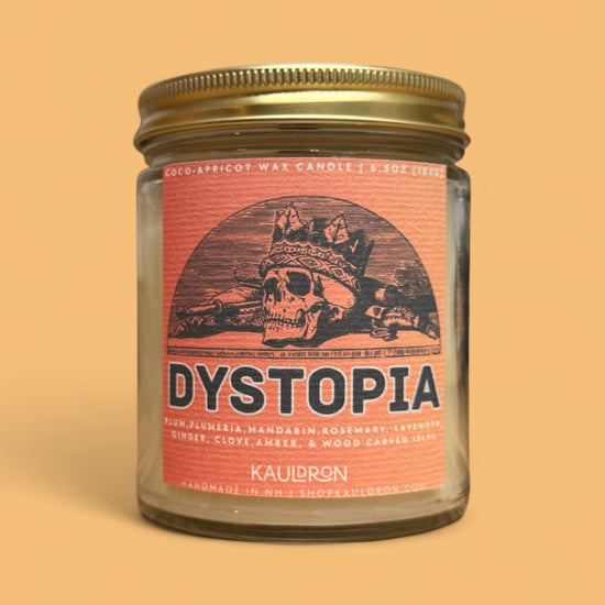 Dystopia is a candle that drifts between beauty and decay. Dark plum and exotic plumeria mingle with bright mandarin, while rosemary, lavender, ginger, and clove add a spicy, shadowed edge. Warm amber and wood-carved isles anchor the scent, creating a haunting fragrance that feels like wandering through a world both strange and unforgettable.
